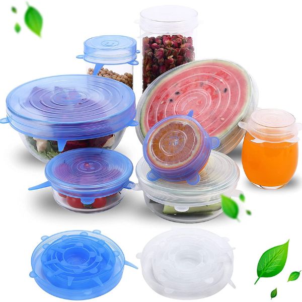 6 Pack super-stretch silicon lids fit any size 7cm to 26cm in diameter and will stretch to fit most shapes Reusable food-grade silicone lid Environmentally friendly-perfect replacement for plastic wrap Fit any bowl or Container 6 Pack set includes: Diameter: 7cm/10cm/12cm/15cm/17cm/20cm. Dishwasher safe.